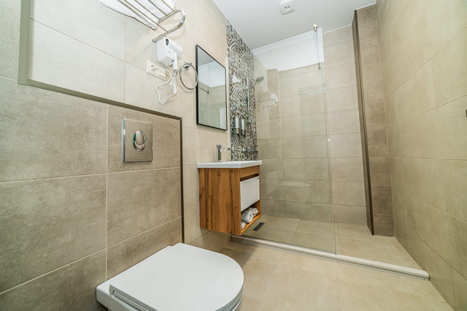 🚿 Ванная комната с душем, феном и туалетными принадлежностями.