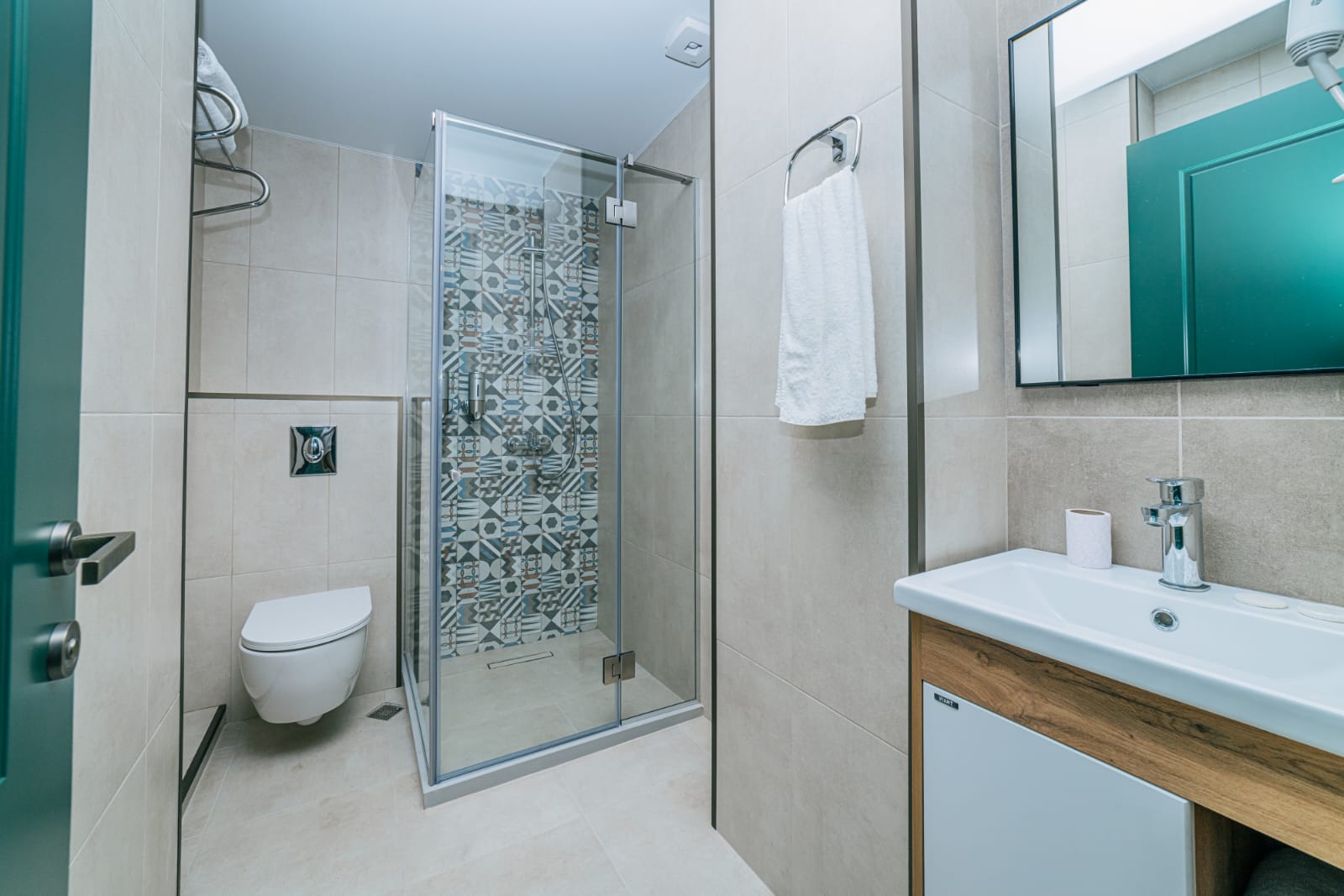 🚿 Ванная с душем, феном и туалетными принадлежностями.